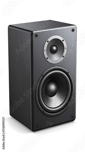 © lambuh, Fototapeta premium A studio-style black loudspeaker with two drivers and a clean, white background