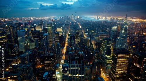 © Justlight, Obraz premium A stunning aerial view of a city at night with ling lights and glowing skysers as far as the eye can see. The use of biofuels as an energy source not only helps reduce carbon emissions .