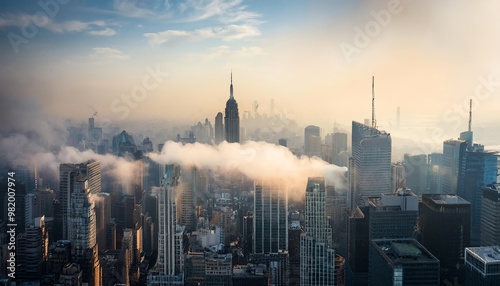 © A-TiMe , Obraz premium A stunning aerial view of a city skyline shrouded in morning mist, highlighting iconic skyscrapers and a serene atmosphere.
