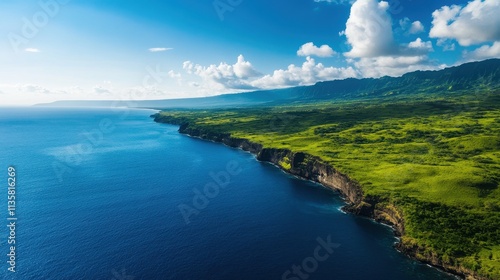 © Kenn W., Obraz premium A stunning aerial view of a lush green coastline meeting a vibrant blue ocean under a bright sky with fluffy clouds.