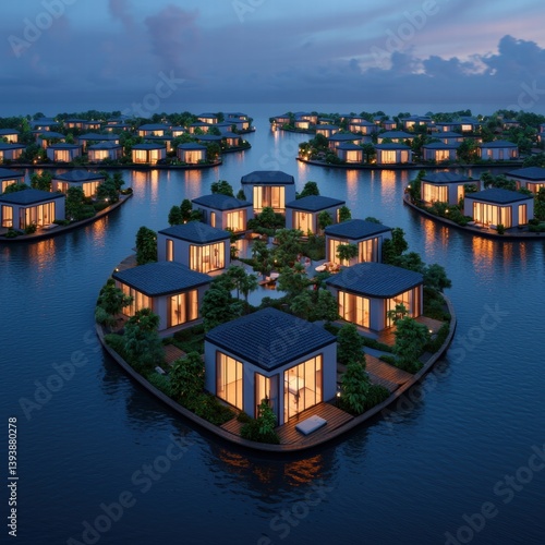 © Jeannaa, Fototapeta premium A stunning aerial view of modern floating houses surrounded by water, showcasing lush greenery and tranquil lighting at dusk.