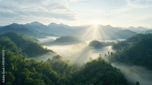 © Sergey, Fototapeta premium A stunning aerial view of the Amazon rainforest at sunrise, with misty valleys and lush greenery illuminated by golden sunlight.