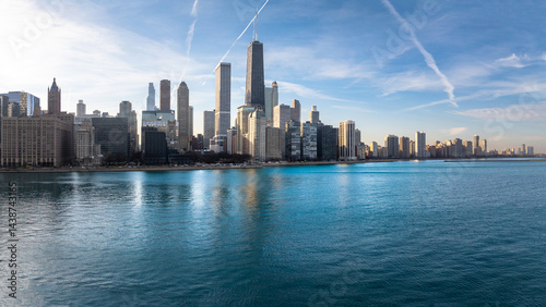 Fototapeta premium A stunning aerial view of the Chicago skyline along the Lake Michigan waterfront on a clear, sunny day. Skyscrapers rise above the shimmering blue water, with crisp contrails streaking across the vibr