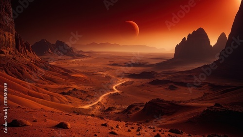 © Robert, Naklejka premium A stunning alien landscape featuring red sands, towering rock formations, and distant planets in a twilight sky. Perfect for science fiction or space-themed projects