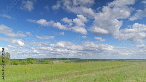 Fototapeta premium A stunning and captivating panoramic landscape features a bright blue sky and vibrant green fields Time lapse.