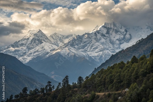 Fototapeta premium A stunning and majestic snowy mountain range with a beautiful river flowing...
