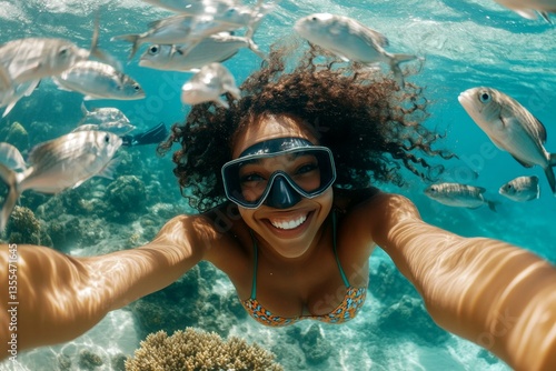 © G - Sto Xet, Fototapeta premium A stunning and sexy happy black young woman with curly hair in a swimming mask and fins snorkeling among the corals. Sunlit underwater beauty. A dense school of silver fish swims next to her.