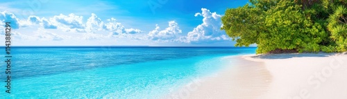 © Wimon, Fototapeta premium A stunning beach scene with crystal-clear turquoise water, white sandy shores, and lush palm trees under a bright blue sky.