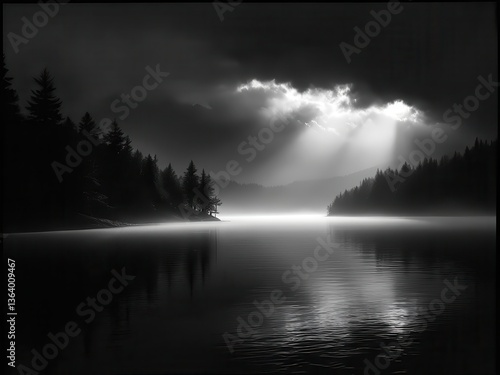 © akim, Fototapeta premium A stunning black and white photograph capturing a serene mountain lake surrounded by towering trees and majestic mountains. The mist around the water and the dramatic sky create a mystical atmosphere,
