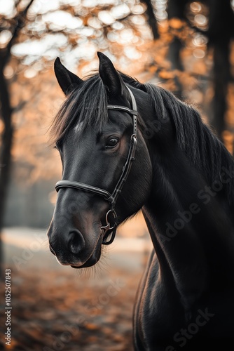 Obraz premium A stunning black horse stands poised in a rustic fall forest, radiating...