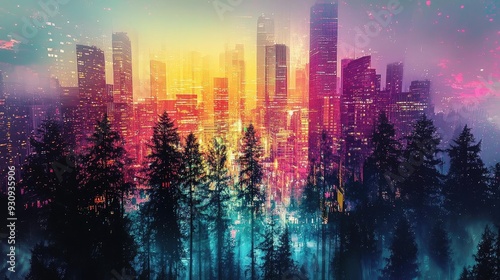Obraz premium A stunning blend of urban skyline and forest, showcasing vibrant colors and...