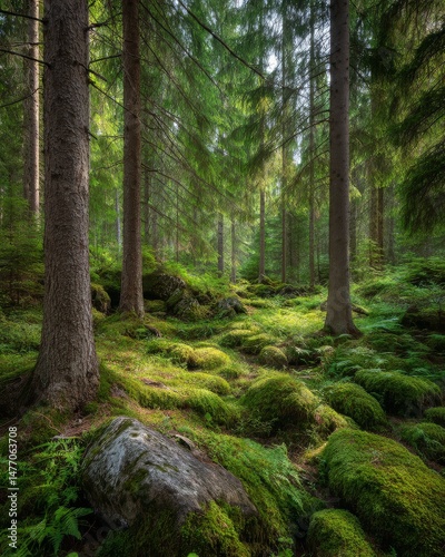 © J. Thamanoon, Fototapeta premium A Stunning Boreal Forest with Lush Moss and Majestic Trees Supporting Ecosystem Biodiversity and Conservation Efforts
