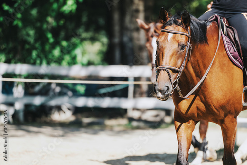 Fototapeta premium A stunning brown horse, fully tacked, gracefully moves forward with its rider...