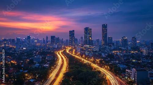 Fototapeta premium A stunning city skyline at dusk, featuring skyscrapers and a winding road illuminated by car lights, with a vibrant sunset backdrop.