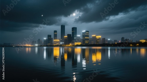 Naklejka premium a stunning city skyline at night with a full moon in the sky, illuminated by the lights of the buildings and reflecting off the water below The sky is filled with