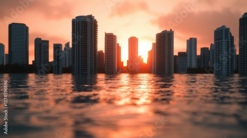 Fototapeta premium A stunning city skyline at sunset, reflected in calm waters, creating a...