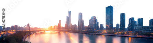 © คมกฤช สาบุดดา, Fototapeta premium a stunning cityscape at sunset, with tall skyscrapers reflected in the calm water of a river