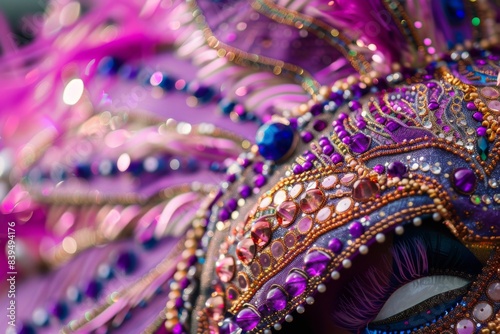 © Jennie Pavl, Obraz premium A stunning close-up of a meticulously crafted samba dancer costume adorned with shimmering beads and sparkling glitter, designed for the vibrant celebration of Carnaval in Brazil.
