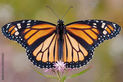 © whitestorm, Fototapeta premium A stunning close-up of a monarch butterfly delicately perched on a flower, showcasing its intricate wing patterns and vibrant colors against a soft background.