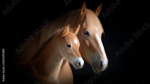 © Irina Ukrainets, Obraz premium A stunning close-up of a mother horse and her foal. This image captures their gentle expressions and strong bond. Perfect for nature lovers and animal enthusiasts. AI