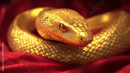 Fototapeta premium A Stunning Close-up of a Realistic Golden Snake on a Luxurious Red Velvet Fabric, Showcasing Intricate Scales and Mesmerizing Eyes