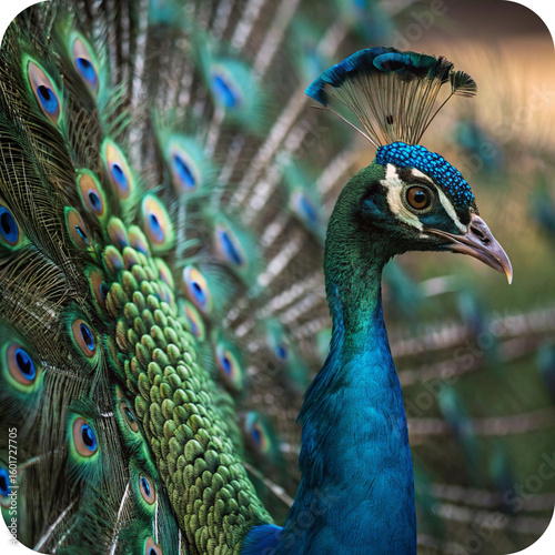 © Rehan, Fototapeta premium A stunning close-up portrait of a colorful blue and green peacock with vibrant, fanned feathers, showcasing its beautiful eye and intricate plumage