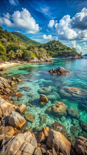 Fototapeta premium A stunning coastal landscape featuring a rocky shoreline and crystal-clear...