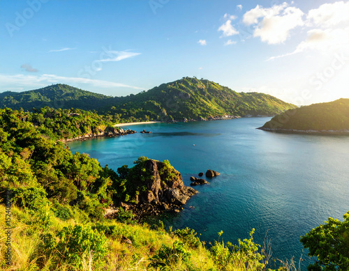 Naklejka premium A stunning coastal landscape showcases lush green hills surrounding a calm, crystal-clear bay under a bright, sunny sky, evoking a sense of peace and natural beauty.