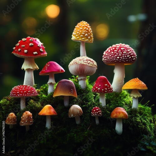 © AshrofS, Obraz premium A stunning collection of colorful mushrooms growing among lush green moss in a serene forest setting.