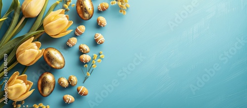 © Gular, Fototapeta premium A stunning composition with Easter themed golden eggs yellow tulips and painted wooden eggs on a blue background offering ample copy space for text creating a beautiful greeting card template