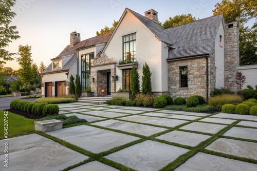 © gamespirit, Naklejka premium A stunning contemporary house featuring elegant stone accents, complemented by a beautifully landscaped garden, is perfectly illuminated at dusk within a tranquil neighborhood setting