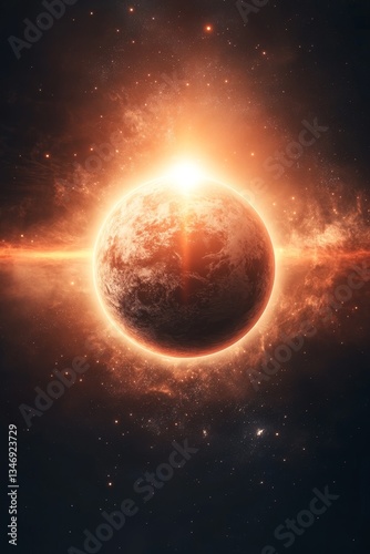 © stardadw007, Obraz premium A stunning cosmic scene featuring a glowing planet surrounded by vibrant celestial phenomena and radiant light.
