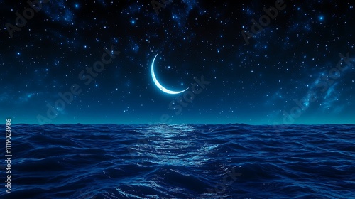 Fototapeta premium A Stunning Crescent Moon Rising Over the Calm Ocean Waters at Dusk