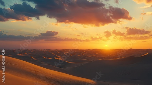 Obraz premium A stunning desert landscape at sunset, with golden sand dunes and a colorful sky filled with dramatic clouds,