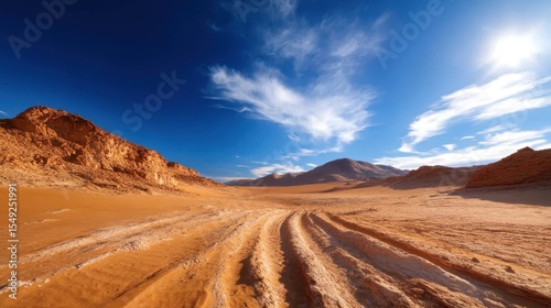Fototapeta premium A stunning desert landscape showcases vast sandy terrain and rugged mountains...