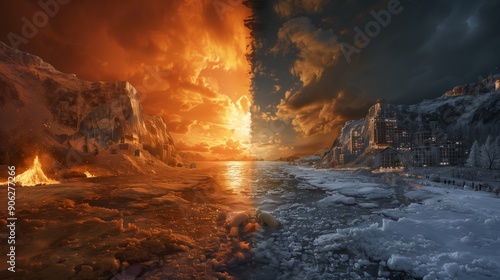 Naklejka premium A stunning digital illustration depicting the stark contrast between two halves of the world affected by climate change.