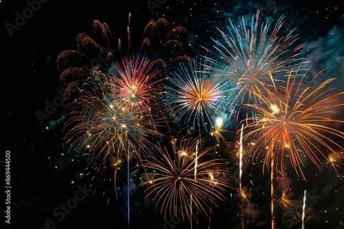 Naklejka premium A stunning display of colorful fireworks exploding in the night sky, casting...