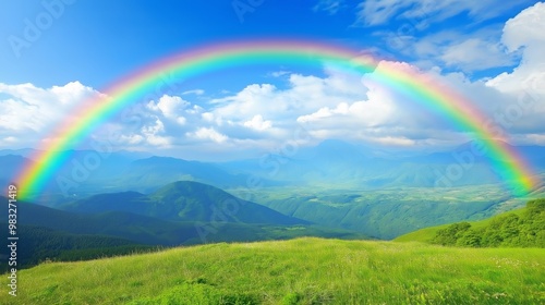 Fototapeta premium A stunning double rainbow arches over a lush green valley surrounded by mountains under a bright blue sky with fluffy clouds