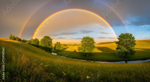 Naklejka premium A stunning double rainbow arcs over a lush green field with trees and a small stream.