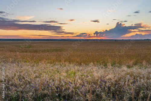 © Sergei, Obraz premium A stunning dusk view featuring expansive golden fields and a vibrant sunset sky filled with clouds reflecting warm hues.