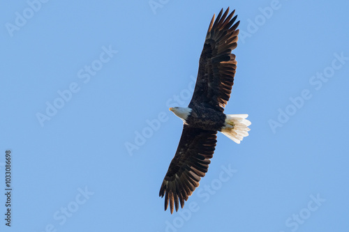 © Michael, Naklejka premium A stunning eagle, with its impressive wingspan, glides majestically across a bright blue sky, embodying freedom