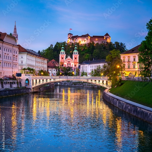 Naklejka premium A stunning evening view of Ljubljana with its riverfront, Triple Bridge, and the illuminated Ljubljana Castle.