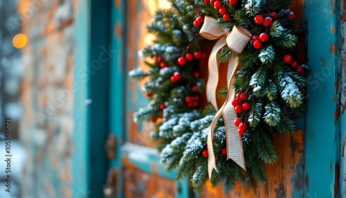 Fototapeta premium A stunning evergreen garland adorned with vibrant red berries and a luxurious bow, elegantly draped on a rustic wooden door, with soft snow gently accumulating at the base, embodying seasonal charm