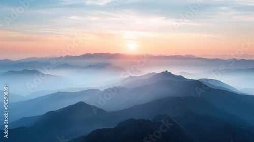 Obraz premium A stunning foggy mountain range at sunrise, with layers of hills creating a...