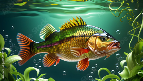 Fototapeta premium A stunning freshwater perch, freshly caught and displayed as a fishing trophy, floating in clear water. The fish features a detailed and vibrant color palette, including yellow and green hues,