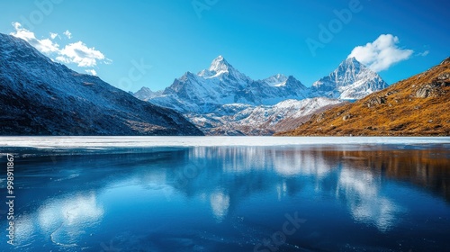 Fototapeta premium A stunning frozen mountain lake, surrounded by snow-capped peaks under a clear blue sky, creating a breathtaking winter landscape