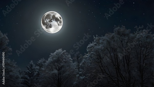 Fototapeta premium A stunning full moon rising in a clear night sky, casting a silver glow over a serene forest landscape, representing the mystical 'wolf moon' in January,Generative Ai