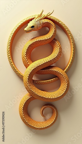 © Makaron, Obraz premium A stunning golden serpent forming an ouroboros design, symbolizing eternity and cyclical nature. Perfect for illustrations in mythology, wellness, and spiritual themes.