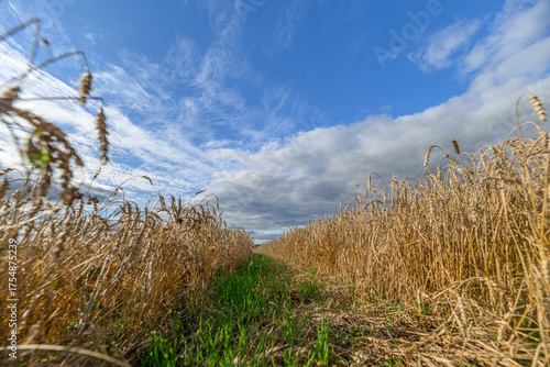 © beholdereye, Fototapeta premium A Stunning Golden Wheat Field Spreading Under a Clear Blue Sky Filled with White Clouds