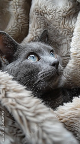 © Audy, Obraz premium A stunning gray cat with deep golden eyes sits poised and alert.